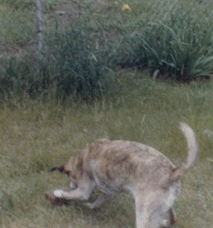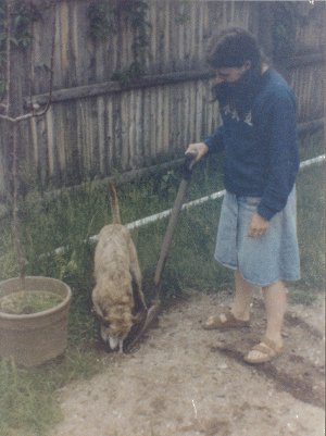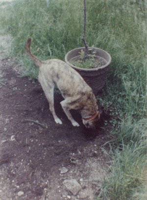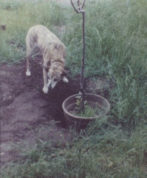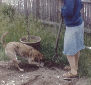 From these humble beginnings developed my "gardening dog." In 1983 when I moved to a house with my own piece of land to work, Gillian turned out to be a tireless and dependable worker. When I laid out my vegetable garden, she worked at my side, digging beside the pitchfork, tossing soil, digging out rocks and stones, turning the earth, and keeping at the job until I called a halt. Her love of buried rocks was especially helpful. She dug them out with enthusiasm and removed them to the lawn, where I could easily gather them for disposal. Perhaps she was a trifle sloppydirt flew everywherebut she was willing to be repositioned so dirt fell where I wanted and the rest could be raked back into place easily. She wasn't always accurate and at times I got covered with flying dirt, but then gardening is dirty work anyway. Once the garden was planted, with sticks and string defining the boundaries, she never entered it againif her ball rolled inside she waited at the string for me to retrieve ituntil autumn when the plants died and the sticks and string were removed. Then she might even go in to retrieve her ball herself or retrieve a stray cherry tomato, but she wouldn't dig in the garden until planting season.